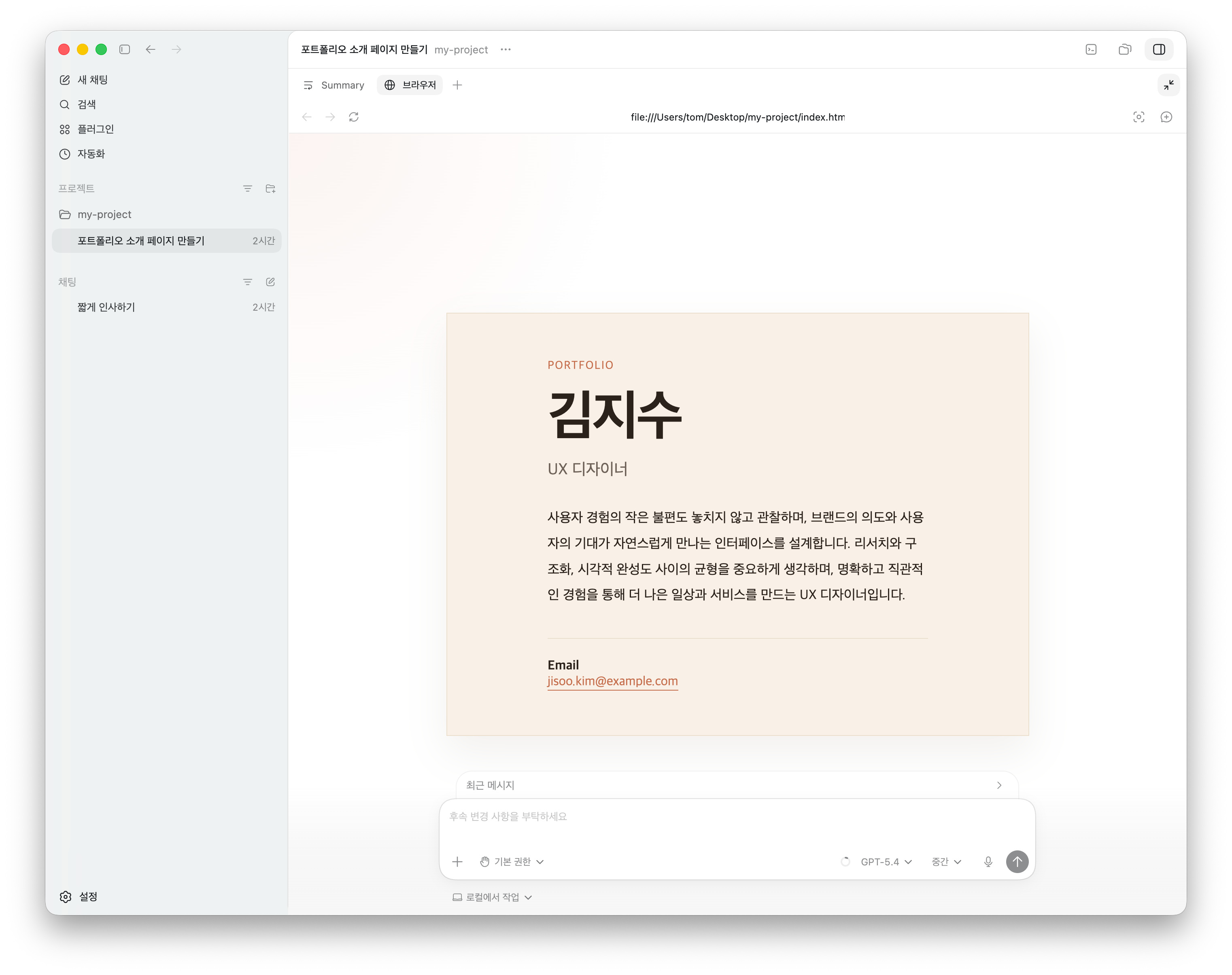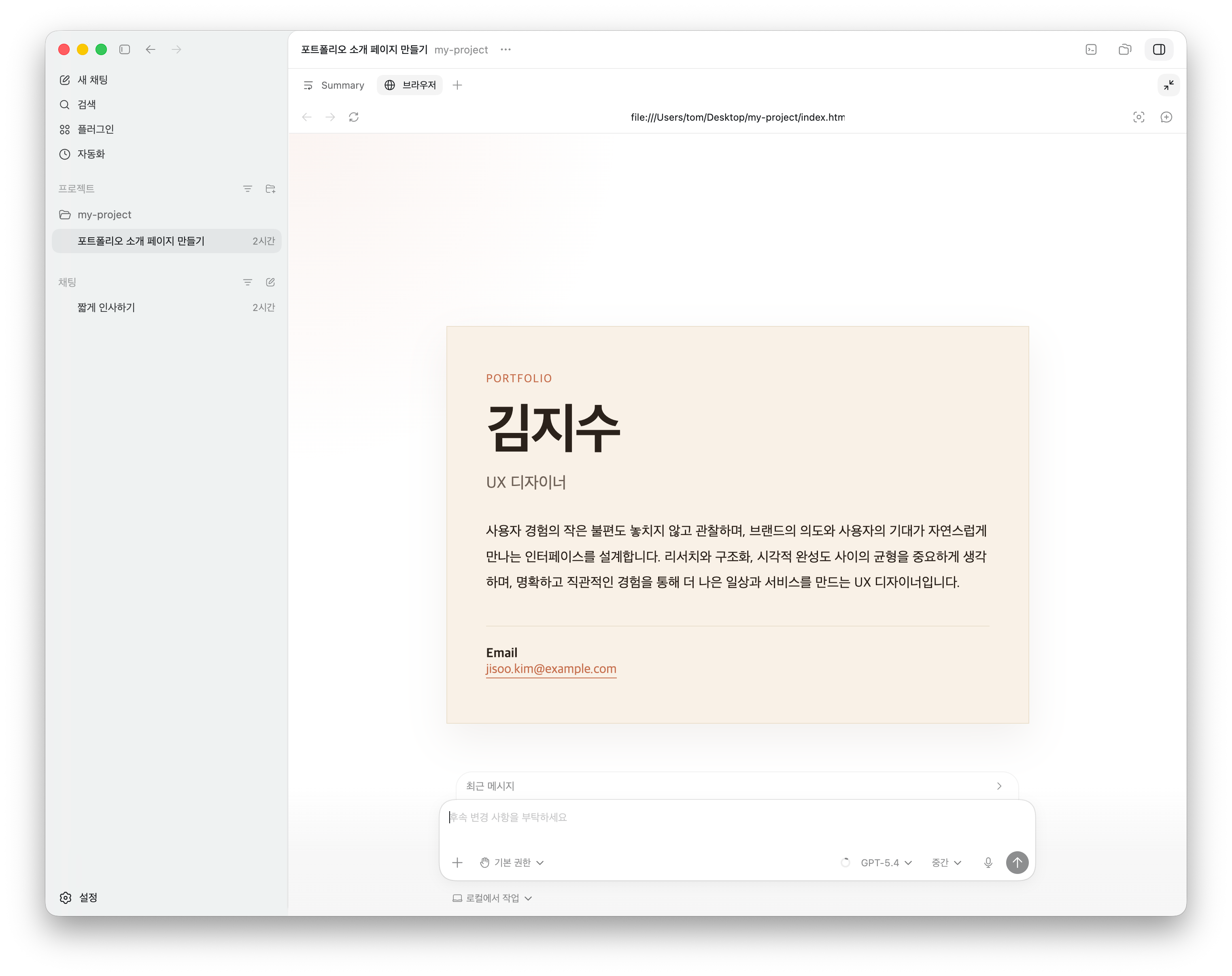 레이아웃이 잡혔으면 문구를 다듬어요. 페이지 안에 실제로 있는 텍스트(예: 'PORTFOLIO' 라벨, 직업 부제, 자기소개 첫 문장)를 골라서 바꿔달라고 하면 돼요.