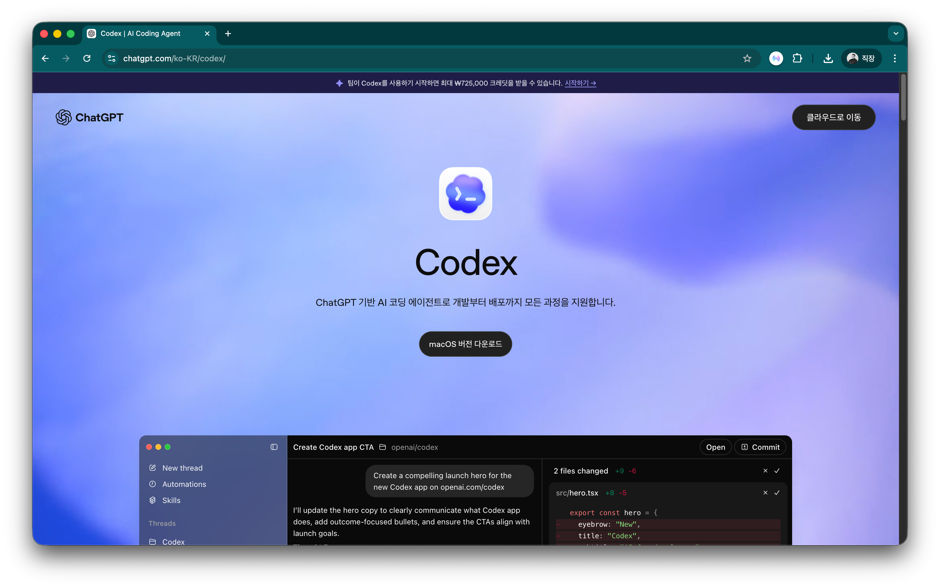 - chatgpt.com/ko-KR/codex 로 이동해요.