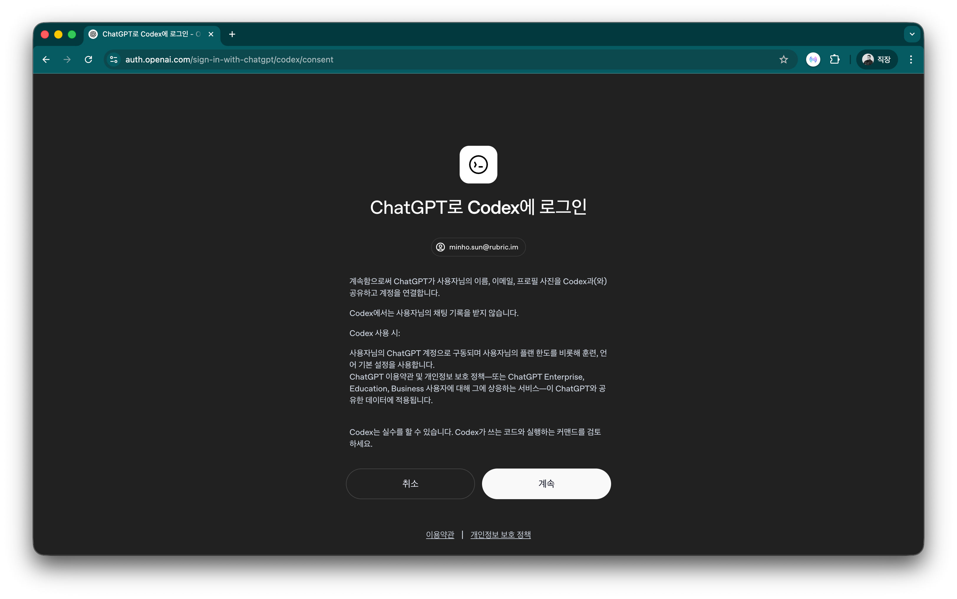 2단계 — Codex 연결 동의. "ChatGPT로 Codex에 로그인" 화면이 나오고, 계정 정보를 Codex와 연결하는 데 동의를 받아요. 계속 버튼을 누르면 끝이에요. (참고: 이 화면이 안내하듯, Codex는 ChatGPT의 채팅 기록을 받지 않아요. 별도의 작업 환경이에요.)