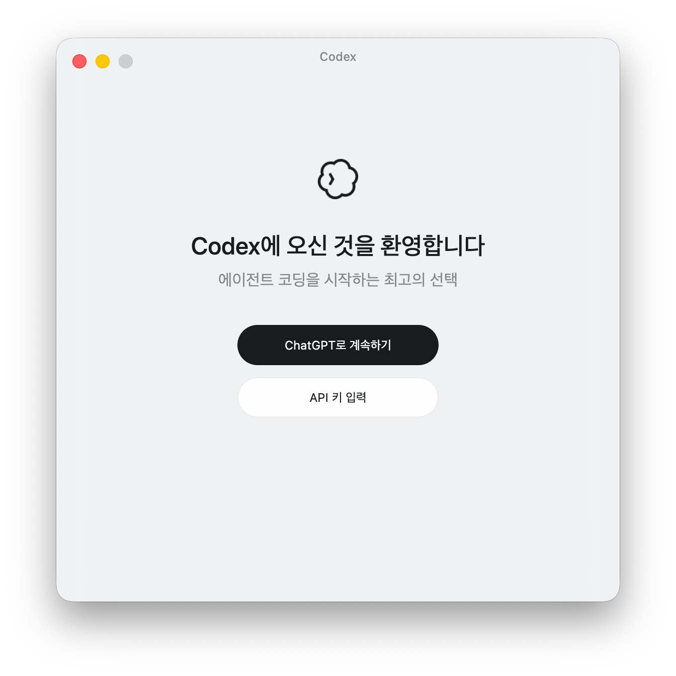 앱을 처음 열면 환영 화면이 나타나요. **"ChatGPT로 계속하기"**와 "API 키 입력" 두 가지 버튼이 보이는데, **"ChatGPT로 계속하기"**를 눌러요. (API 키 입력은 우리 커리큘럼에서 사용하지 않아요.)