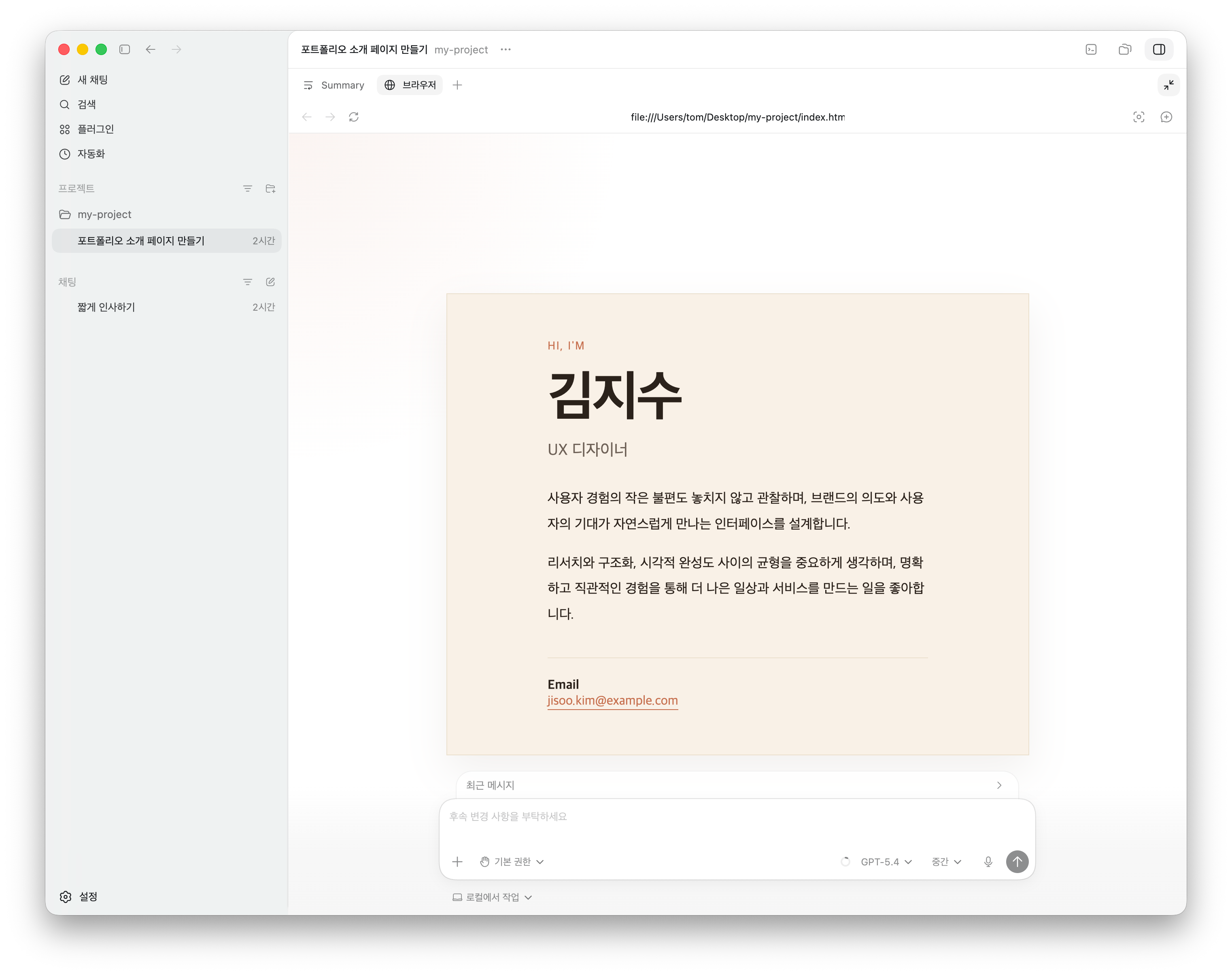 레이아웃이 잡혔으면 문구를 다듬어요. 페이지 안에 실제로 있는 텍스트(예: 'PORTFOLIO' 라벨, 직업 부제, 자기소개 첫 문장)를 골라서 바꿔달라고 하면 돼요.