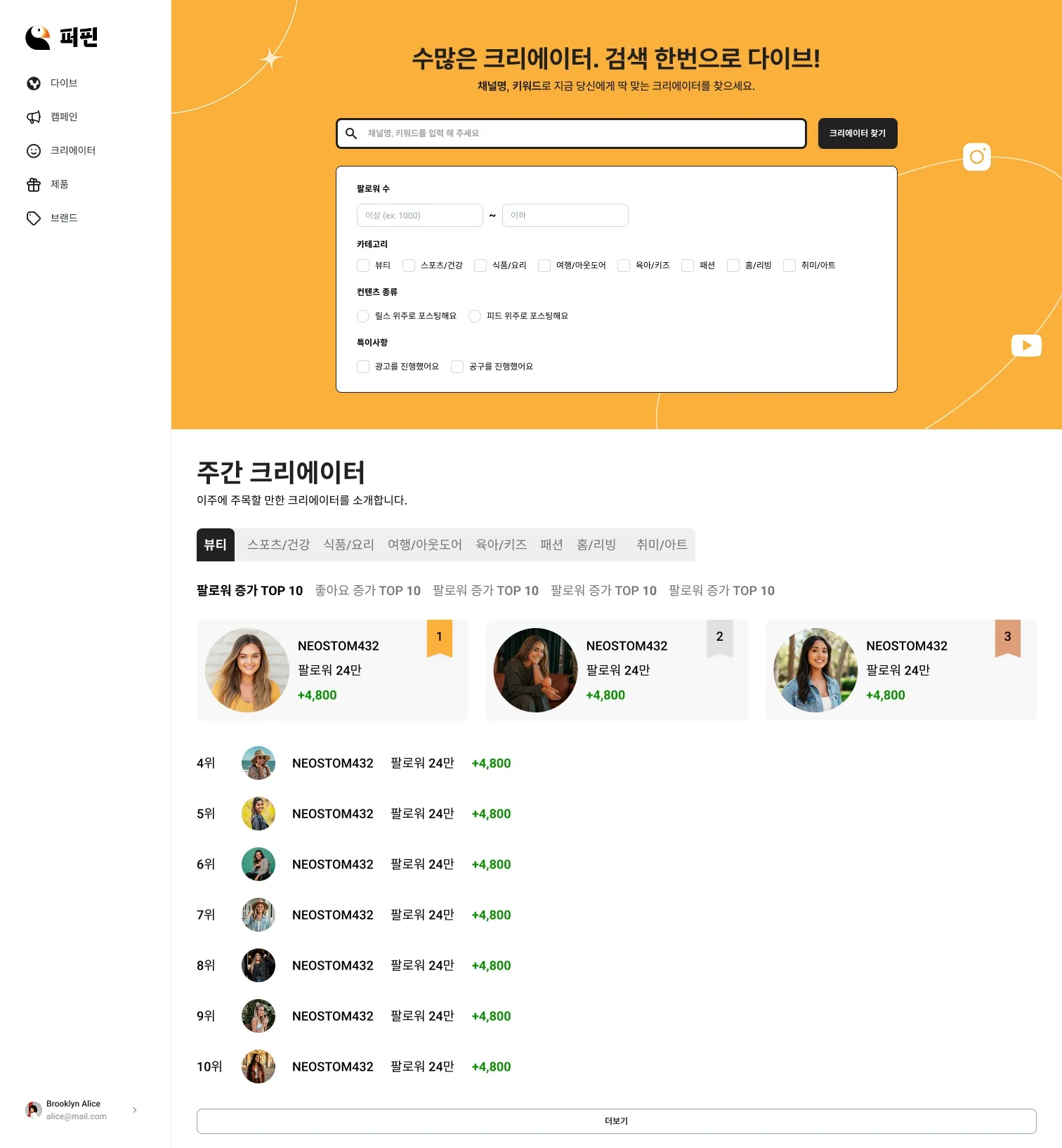 - UI/UX 최적화: 브랜드 및 인플루언서 양측 모두에게 직관적인 인터페이스 제공, 데이터 시각화 중심의 대시보드로 캠페인 현황을 한눈에 파악 가능