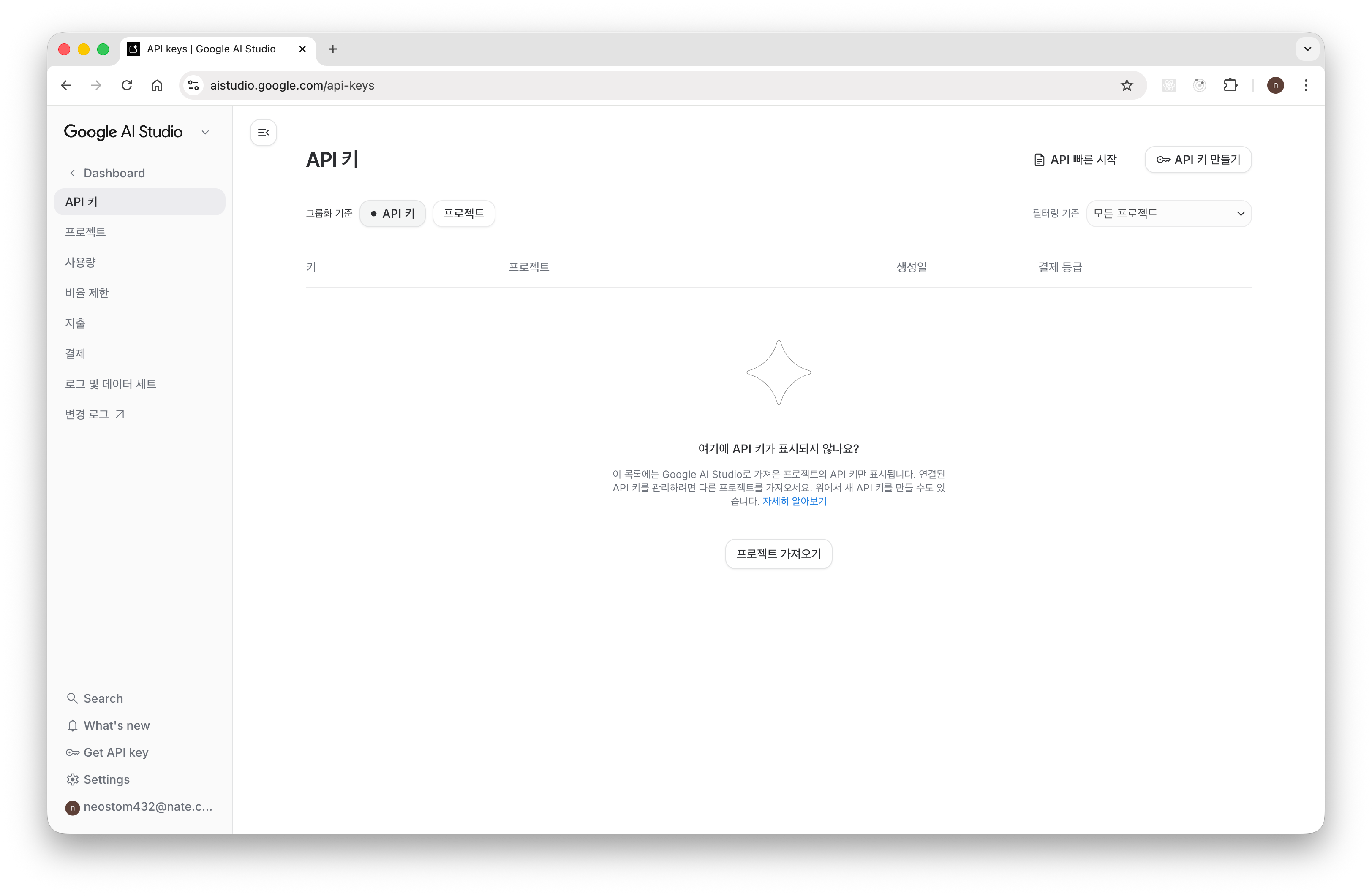 Google AI Studio 사이트에 접속해서 Google 계정으로 로그인해요. 좌측 사이드바 하단에 Get API key 버튼이 있어요. 클릭하면 키 목록 페이지가 나오고, Create API key를 누르면 새 키가 즉시 생성돼요.